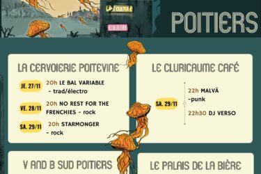 POITIERS concerts du 27 au 29 novembre FESTIVAL CULTURE BAR-BARS À LA CERVOISERIE La Cervoiserie vous accueille les 27, 28 et 29 novembre pour le... En savoir Plus "LA CERVOISERIE"