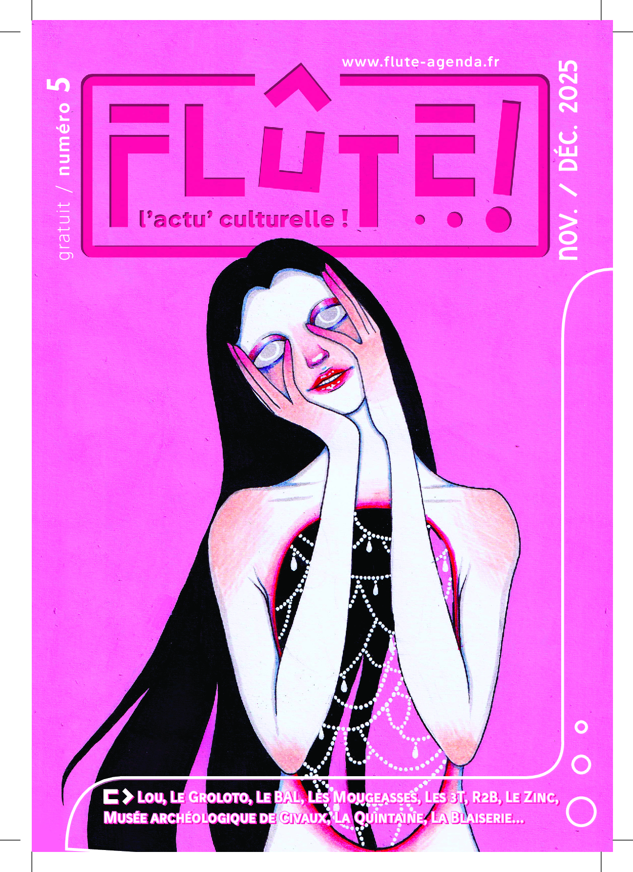 Dans notre dernière édition pour 2025, nous vous présentons Lou Dopen, dont les œuvres mêlant douceur et déchirure illustrent notre ultime couverture de l’année. À travers ce numéro 5 qui affiche toujours plus de diversité, l’équipe de Flûte ! remercie tous ses soutiens, annonceurs et autres collectionneurs·es de nos affiches et éditions papier, car nous serons officiellement présents pour une nouvelle année en 2026, avec un événement anniversaire à L’Envers du Bocal en mars où vous pourrez venir nous rencontrer et échanger avec nous. De nouveaux projets se dessinent pour réaliser une partie des perspectives que nous avons imaginées, dont nous vous ferons la surprise très bientôt. Quartier Libre, qui vient de fêter ses 5 ans sera encore une fois à nos côtés avec son équipe à l’énergie inépuisable pour participer avec nous à la mise en lumière de la vie associative et culturelle, et c’est tant mieux !