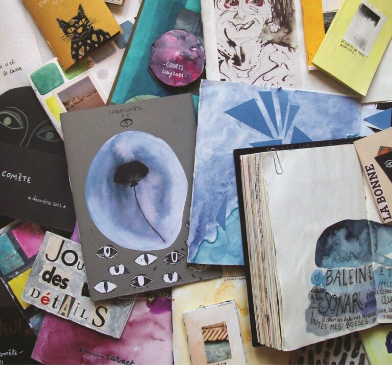 Les Carnets-Comètes sont des journaux intimes visuels. Depuis 2011 ils rassemblent collages, dessins, citations éparses. Carnets, parce qu’ils sont véritablement des carnets, la plupart cousus à la main ; Comètes, parce qu’ils sont le réceptacle d’une pensée impérieuse et éphémère qui fuse et se consume sur le papier. Entre leurs pages, aucun croquis préparatoire, aucune recherche stylistique, mais la nécessité brute de devoir écrire, peindre, dessiner, découper, coller, là maintenant. Plus de 30 spécimens forment un récit en creux de la vie d’Adélaïde.