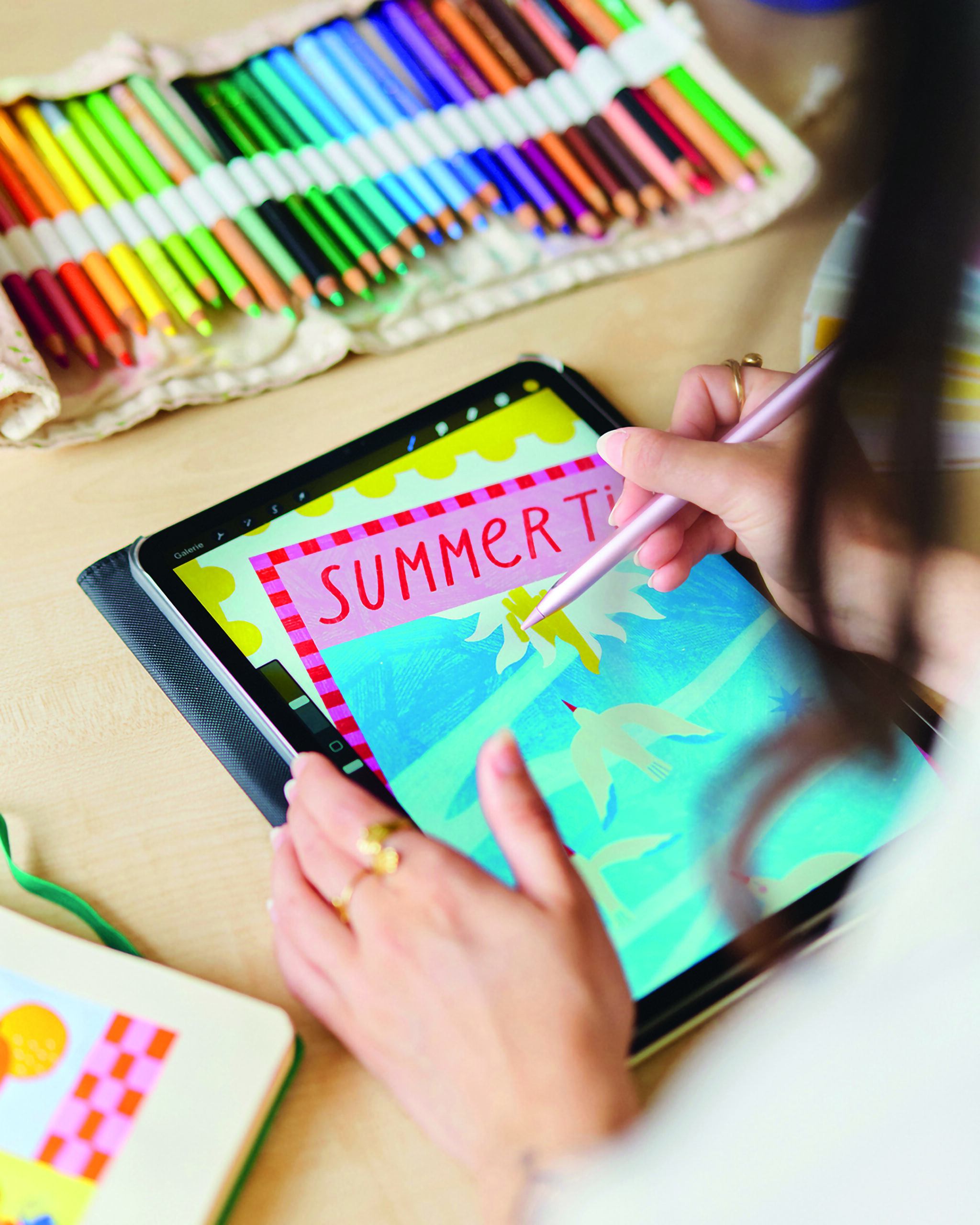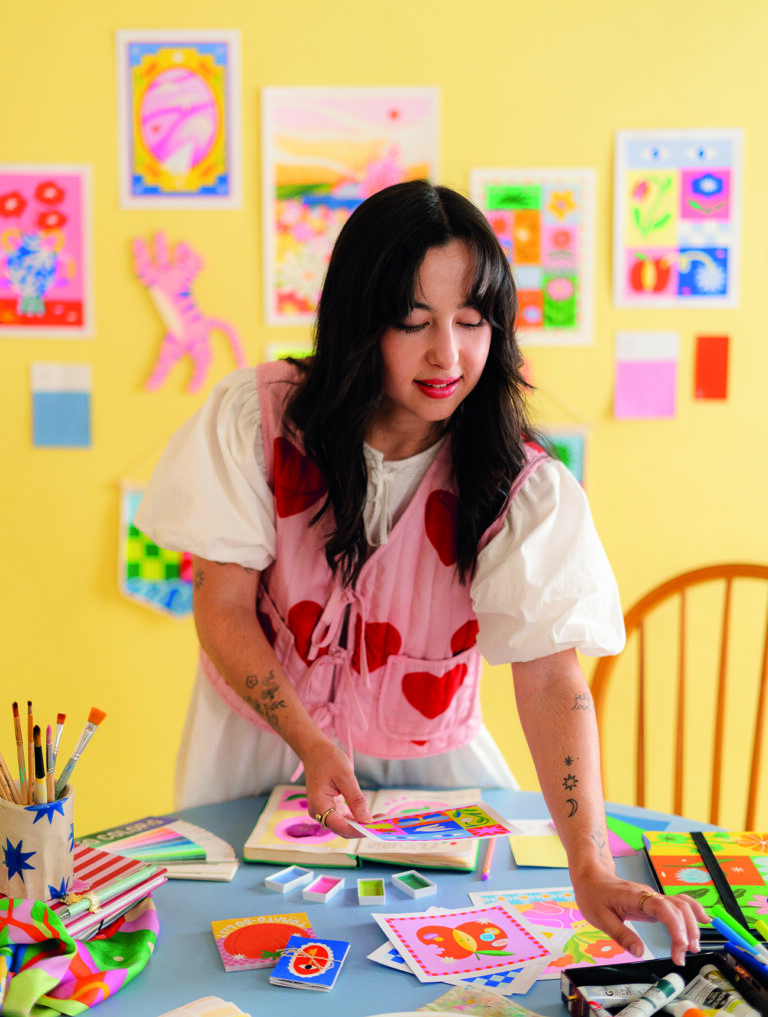 Artiste munie d’une imagination débordante, Noémie Hay alias Limistic a d’abord étudié le design graphique et la direction artistique à Paris avant de suivre sa passion pour l’illustration. Désormais installée à Poitiers, sa ville natale, elle explore la diversité des supports et n’hésite pas à investir sa créativité dans différentes techniques telles que la peinture ou la céramique, même si le digital reste son médium de prédilection. Son univers joyeux aux couleurs vibrantes s’inspire principalement de la nature et de l’émerveillement du quotidien. Il comporte une part d’insouciance, de rêverie poétique et reste délibérément positif. En transformant ses moments de vie et ses excursions en décors foisonnants, elle fige ses souvenirs et y apporte sa touche personnelle : paysages fleuris, objets amusants, fruits, gourmandises et délicieux patchworks font sa marque de fabrique.